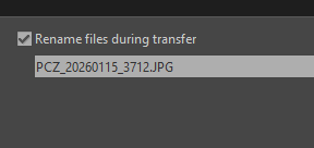 Zmieniam nazwę plików podczas transferu Rename files during transfer; stosuję szablon Inicjały_datę wykonania zdjęcia_nr kolejny.
